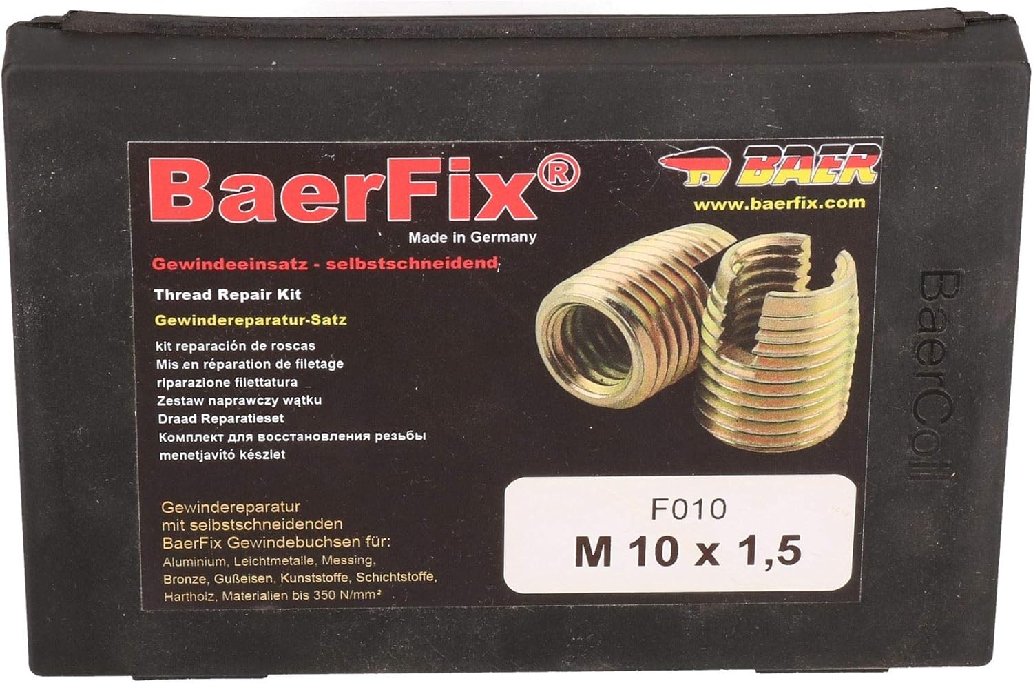 Professional thread repair kit for commercial or occasional use BaerFix thread repair kit manufactured in Germany Ideal for repairing damaged or stripped internal threads Suitable for thread reinforcement or thread repair Easy and simple to use No re tapping is necessary with this tool Creates a stronger internal thread in softer materials Permanent repair to worn and damaged threads Metric size M10 x 1.5 This items cuts its own threads High connection with workpiece for strength and durability Corrosion resistance Suitable for all metal and plastic applications The joints created are vibration resistant, wear free and have a high load capacity in materials with low shearing strength The inserts are manufactured from case hardened steel and then zinc plated for maximum hardness Manufactured according to tolerance ISO 2768-m Very high pull out strengthSIMPLE TO USE 1. Clear the damaged thread with a drill 2. Screw the BaerFix insert with the cutting slides pointing downwards on the inserting tool and then lock the BaerFix insert with the nut by wrench 3. Screw the BaerFix insert into the borehole, the BaerFix thread insert is self-tapping and the inserting tool has a 1/4" hexagonal shank and can be used by either a cordless drill or a socket / spanner 4. Unlock the counter nut with a spanner or socket off the inserting tool SET INCLUDES THE FOLLOWING 1 x 13.25mm HSS drill 1 x installation tool 5 x case hardened metric treaded inserts (M10 x 1.5) Comes in a blow molded case for easy storage and transportation